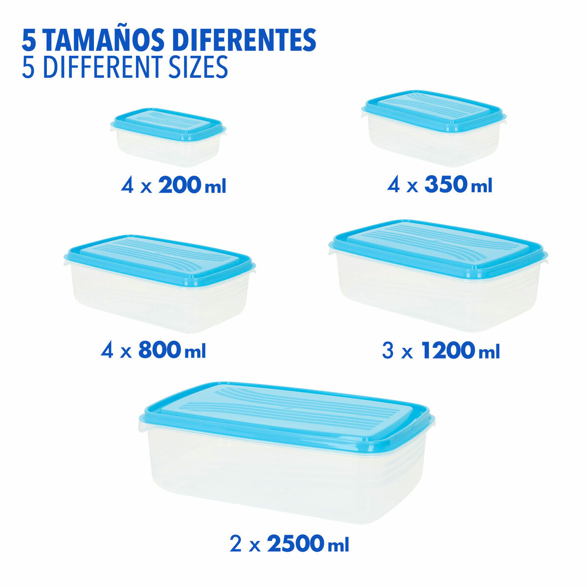 • Variedad de tamaños en un solo pack: este set incluye 17 recipientes con capacidades de 0,2L (4 uds), 0,35L (4 uds), 0,8L (4 uds), 1,2L (3 uds) y 2,5L (2 uds). Perfectos para guardar desde snacks hasta comidas completas