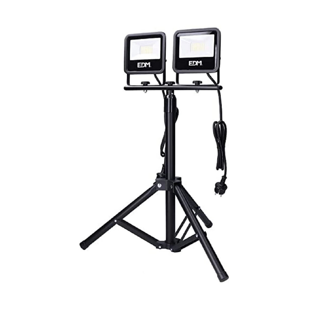 El foco proyector de la marca EDM Product es una solución de iluminación profesional diseñada para ofrecer una alta eficiencia y resistencia en ambientes exigentes. Cuenta con una potencia total de 30W, distribuidos en dos unidades de 30W LED con una luminosidad combinada de 2×2370 lúmenes, lo que garantiza una luz intensa y homogénea en espacios amplios. Su temperatura de color es de 4000K, luz día, ideal para ambientes donde se requiere una iluminación clara y similar a la natural. La estructura del equipo está fabricada en aluminio y plástico, materiales que proporcionan robustez y ligereza, a la vez que aseguran una buena disipación del calor y resistencia a impactos. El proyector presenta una altura regulable desde 63 cm hasta 103 cm gracias a un trípode ajustable, facilitando su ubicación y orientación para adaptarse a distintas necesidades de iluminación. Su diseño incorpora 42 LEDs por unidad con un ángulo de apertura de 120°, permitiendo una amplia cobertura del área iluminada. Además, está protegido con una clasificación IP65, lo que asegura su funcionamiento óptimo incluso en exteriores y condiciones meteorológicas adversas, siendo resistente al polvo y al agua. Su clasificación energética es F, compatible con un voltaje de 220-240V y frecuencia 50Hz, y cuenta con una vida útil aproximada de 25.000 horas, reduciendo la necesidad de mantenimiento frecuente. El producto viene equipado con una clavija schuko de 1,5 metros para una conexión sencilla y segura. El color negro le aporta una apariencia sobria y profesional, adecuada para instalaciones tanto domésticas como industriales. En conjunto, este foco proyector LED representa una alternativa fiable y eficiente para quienes buscan una iluminación potente y duradera con flexibilidad de instalación y resistencia ambiental.