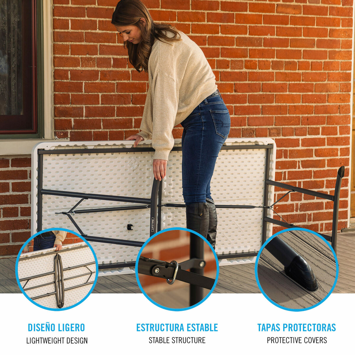 La mesa plegable Lifetime de 152 x 76 cm es la opción perfecta para reuniones, eventos o cualquier uso diario, tanto en interiores como en exteriores. Fabricada con un resistente tablero de polietileno de alta densidad (HDPE) con protección UV y una estructura de acero con revestimiento antióxido, soporta la intemperie, manchas y agua sin deteriorarse. Su diseño con patas plegables permite almacenarla con facilidad sin ocupar espacio y cuenta con anclajes de seguridad y topes de goma para mayor estabilidad en cualquier superficie. Ligera y fácil de transportar, es una mesa funcional y versátil, ideal para hogares, negocios o celebraciones.