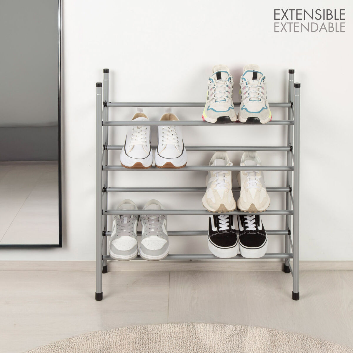 ¡Dale a tu hogar el orden que merece con el zapatero Max Home! Su diseño discreto en gris metalizado aporta elegancia a cualquier estancia, mientras sus cuatro niveles de barras extensibles (62–112 cm) te permiten ajustar la capacidad según tus necesidades. Con unas dimensiones compactas de 62–112x22x67 cm, ofrece un almacenaje funcional y estilizado para tu calzado, y su estructura de acero con topes de plástico resistente aguanta hasta 16 kg sin deformarse, todo con un peso total de apenas 1,57 kg. Además, el montaje es muy rápido y sin herramientas gracias al sistema de encaje tubular: en cuestión de minutos tendrás tu zapatero metálico listo para usar. Con Max Home mantén el orden de tu calzado.